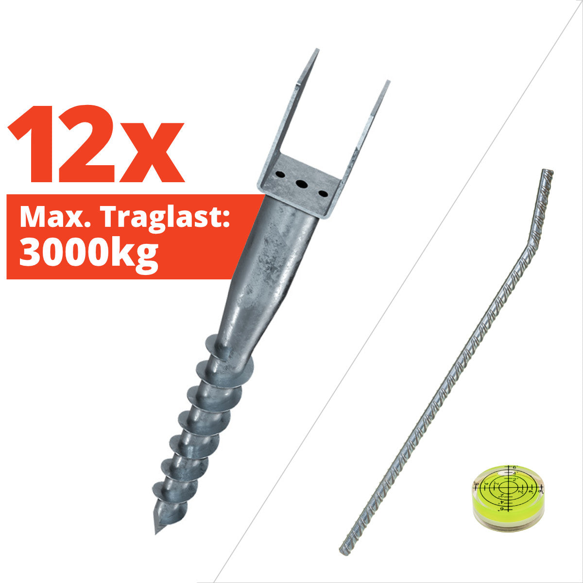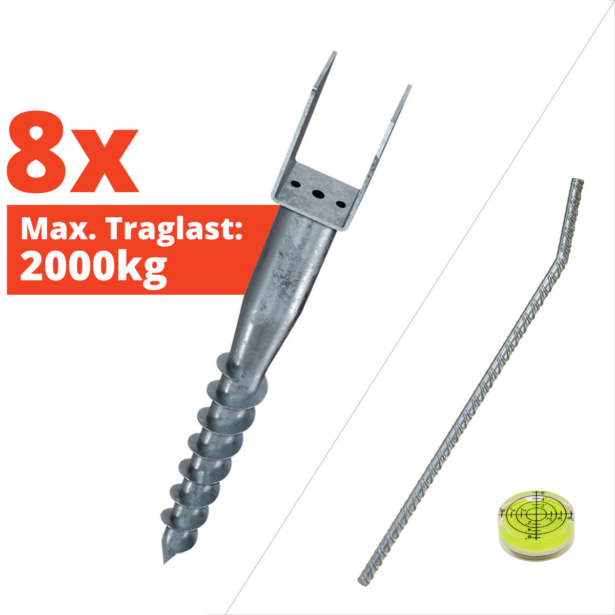 Schraubfundamente (Bodenanker) Befestigungen sind besonders sicher, stabil und optimal geeignet für gängige Holzbalken. Ein großer Vorteil gegenüber einem Beton-Fundament ist das durch die versenkten Schrauben ein Rückbau möglich ist.